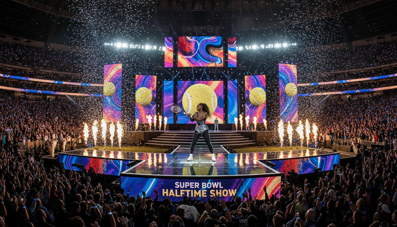 - : Serena Williams makes surprise entrance during Kendrick Lamar’s halftime show, performing the C-Walk as the crowd erupts (ESPN).