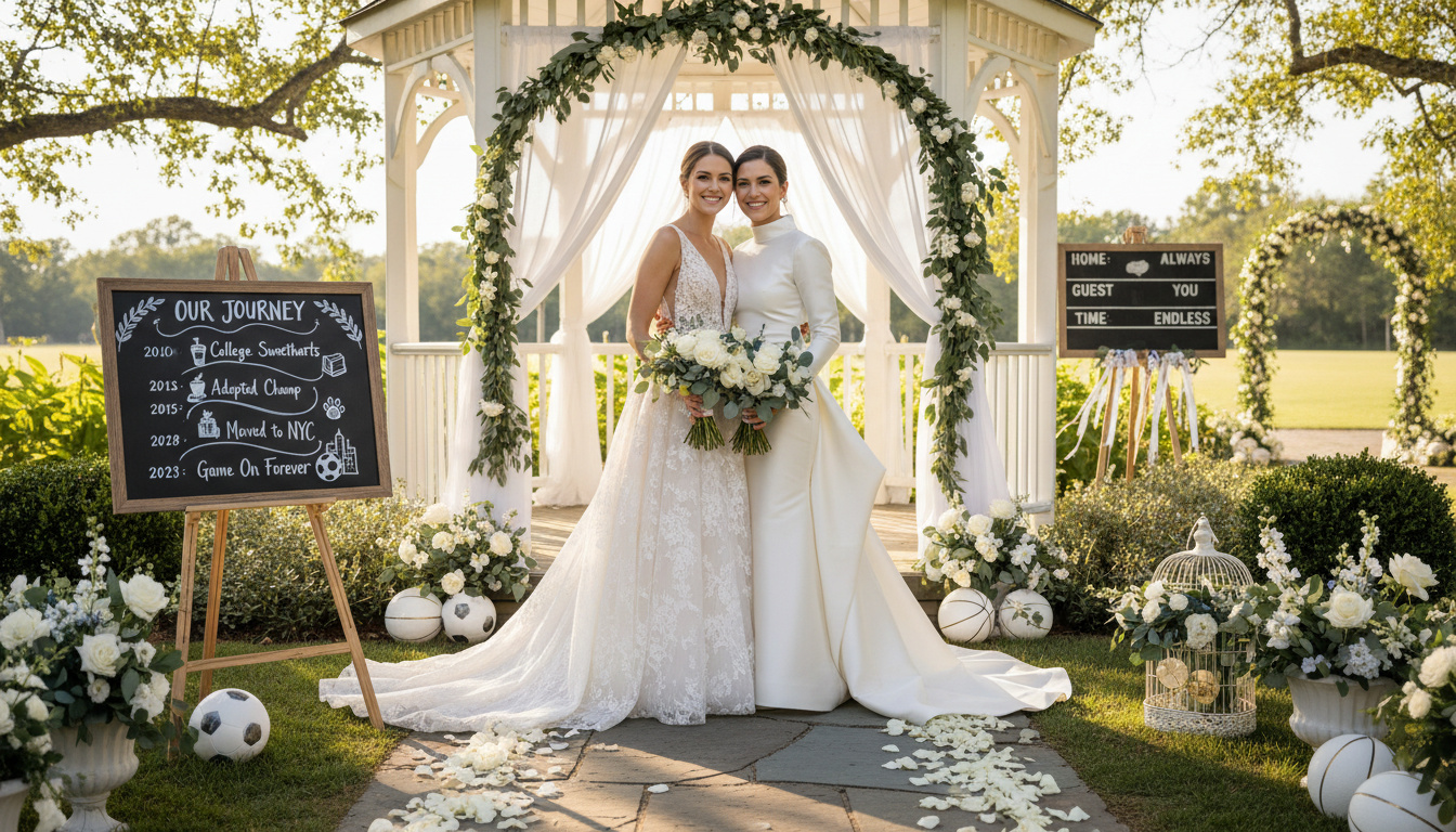 Sue Bird is a WNBA legend and Olympic gold medalist, known for her career with the Seattle Storm. She attended the University of Connecticut (UConn), where she led her team to two NCAA titles. Megan Rapinoe is a FIFA Women’s World Cup champion and Olympic gold medalist, acclaimed for her play with OL Reign and the USWNT. The two met at the 2016 Rio Olympics — their “meet-cute” was Bird in her basketball uniform and Rapinoe struck by her presence (source: The Knot).